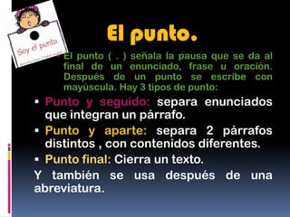 El documento habla sobre los signos de puntuación punto y coma. Explica que el punto se usa para marcar el final de una oración, frase o enunciado y que después de un punto se escribe con mayúscula. También describe tres tipos de punto y cómo se utiliza la coma para marcar una pausa breve dentro de una oración en casos como enumeraciones e incisos.