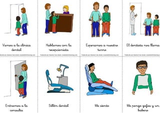 Este documento proporciona instrucciones para crear un kit que incluye fichas ilustradas sobre una visita al dentista. Sugiere imprimir el documento en cartulina gruesa y cortar individualmente cada ficha siguiendo la línea de puntos, y opcionalmente plastificarlas o usar velcro para pegarlas a una superficie. El documento también incluye notas sobre la traducción de las fichas de una organización dedicada a desarrollar pictogramas para apoyar el aprendizaje.