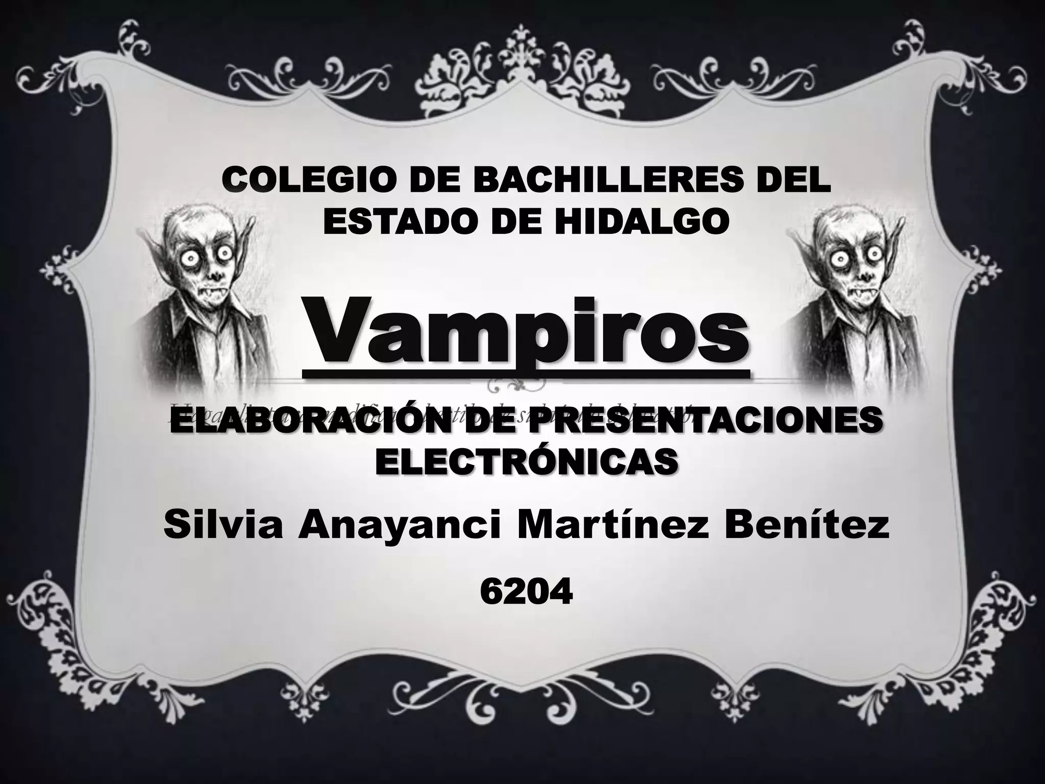 Los vampiros se originan en la mitología y creencias de varios países. Según las tradiciones, son cadáveres inmortales que se alimentan de sangre para mantenerse activos. Presentan características como colmillos, piel pálida y evitan la luz del sol. Para destruirlos, se debe exponerlos al sol, clavarles una estaca en el corazón o decapitarlos. Algunos vampiros famosos incluyen a Drácula, los Cullen y los hermanos Salvatore.