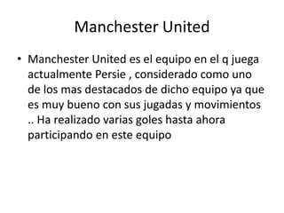 Robin van Persie es un delantero centro holandés que actualmente juega para el Manchester United de Inglaterra, donde ha marcado varios goles. Debutó profesionalmente con el Feyenoord holandés y también jugó ocho temporadas para el Arsenal inglés antes de unirse al Manchester United. Van Persie es el máximo goleador en la historia de la selección holandesa, con la que ha participado en las Copas Mundiales de 2006 y 2010 y las Eurocopas de 2008 y 2012.