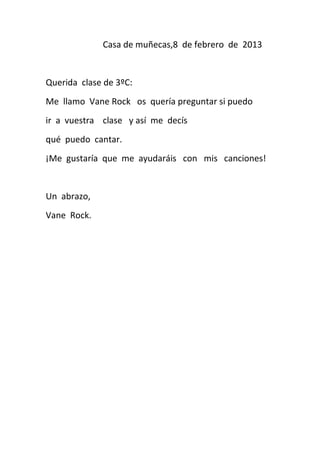 Vane Rock escribió una carta a la clase 3oC pidiendo permiso para visitarlos y pedir su ayuda para elegir canciones que cantar. Quiere que los estudiantes le sugieran ideas para mejorar sus canciones.
