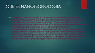 La nanotecnología involucra el estudio y manipulación de la materia a escala nanométrica para desarrollar nuevos materiales y sistemas. Se aplica en medicina, electrónica y otros campos. La biotecnología usa organismos vivos para producir sustancias útiles como alimentos, medicinas y para resolver problemas ambientales manipulando procesos bioquímicos a nivel genético. Ambas tecnologías ya se usan ampliamente aunque se esperan mayores avances.