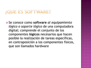 El documento define y explica varios conceptos clave relacionados con el software. Explica que el software son las instrucciones lógicas que permiten que una computadora realice tareas específicas, a diferencia del hardware que son los componentes físicos. Luego describe las principales partes del software, incluyendo sistemas operativos, paquetes de servicios, controladores, lenguajes de programación y aplicaciones. También define brevemente qué es un sistema operativo, paquetes de servicios y lenguajes de programación.