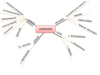 El documento habla sobre los conceptos de liderazgo, autoridad, presencia y capacitación como características de un líder. También menciona las diferencias entre un líder y un jefe, señalando que un líder asume la responsabilidad de los errores de sus subordinados, mientras que un jefe solo se enfoca en su presencia y capacitación. Además, identifica las virtudes y valores de un emprendedor como la excelencia, honestidad y solidaridad.