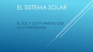 El documento describe el Sistema Solar, dividiendo sus componentes en tres categorías: planetas, planetas enanos y cuerpos pequeños. Explica brevemente cada planeta, desde Mercurio hasta Neptuno, destacando sus características fundamentales como su tamaño, composición y nombre en relación a dioses de la mitología. Resalta la Tierra como el único planeta habitado y su capacidad para albergar vida gracias a su atmósfera y agua.