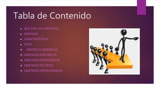 El documento describe los objetivos de una empresa, incluyendo las ventajas de establecer objetivos, sus características y tipos principales. Explica que los objetivos deben ser medibles, claros, alcanzables, desafiantes y realistas. También describe los cinco tipos principales de objetivos: generales, específicos, estratégicos, tácticos y operacionales.