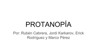 Este documento presenta las biografías de cuatro artistas jóvenes - Marco Pérez, Rubén Cabrera, Erick Rodríguez y Jordi Karkarov - que fundaron un nuevo movimiento artístico llamado Protanopía. Cada uno ha enfrentado dificultades personales como la pobreza, el abandono familiar o discapacidades visuales. A pesar de esto, se han convertido en exitosos pintores y genios creativos que usan su arte para explorar cómo se ve el mundo a través de la visión de los daltónicos.