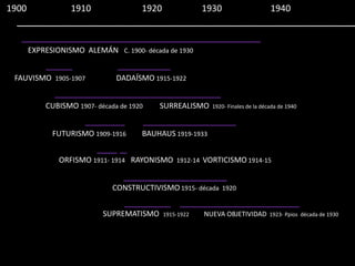 Este documento resume los principales movimientos de vanguardia artística que surgieron en Europa entre finales del siglo XIX y mediados del siglo XX, incluyendo el fauvismo, expresionismo, cubismo, futurismo, suprematismo, constructivismo, dadaísmo y surrealismo. Estos movimientos se caracterizaron por romper con el naturalismo y la academia a través de la experimentación, la investigación de nuevos lenguajes artísticos y la representación de la realidad desde perspectivas no convencionales.