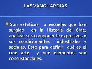 Las vanguardias cinematográficas incluyen el impresionismo, el cine abstracto y el surrealismo. El impresionismo francés valoraba el naturalismo y manipulaba el tiempo a través de flashbacks y sobreimpresiones. El cine abstracto surgido de las artes plásticas rechazaba la representación en favor de las emociones provocadas por las imágenes en movimiento. El surrealismo y dadaísta se caracterizaba por la libre asociación de imágenes sin orden lógico.