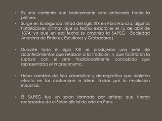 El documento resume el movimiento artístico del impresionismo. Surge en París en la segunda mitad del siglo XIX y se enfoca en capturar la luz y escenas cotidianas a través de pinceladas rápidas y colores vibrantes. Los impresionistas se separaron del estilo académico tradicional y en lugar expusieron su obra en su propio salón después de ser rechazados del Salon oficial de París.