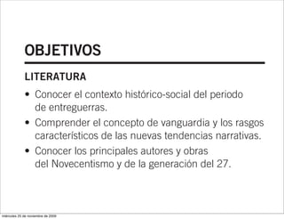 Este documento resume los principales rasgos de las vanguardias literarias y de la generación del 27 en España. Explica el contexto histórico de entreguerras y las nuevas tendencias narrativas. Describe las vanguardias europeas como el creacionismo y el surrealismo, y analiza el novecentismo y la generación del 27, destacando autores como Juan Ramón Jiménez, Federico García Lorca y Rafael Alberti.