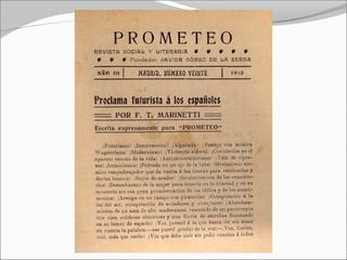 Este documento resume los principales movimientos de vanguardia artística que surgieron en Europa en las primeras décadas del siglo XX, como el futurismo, el fovismo, el dadaísmo, el cubismo y el expresionismo. También describe los movimientos de vanguardia hispánicos como el ultraísmo, el creacionismo y la obra de Ramón Gómez de la Serna. Finalmente, analiza el surrealismo, uno de los movimientos más longevos e influyentes.