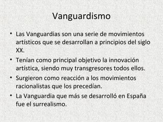 Este documento resume los principales movimientos de vanguardia artística que surgieron a principios del siglo XX en Europa, como el fauvismo, el cubismo y el expresionismo. Explica que el surrealismo fue el que más influyó en España, particularmente en la literatura de la Generación del 27, con autores como Federico García Lorca, Vicente Aleixandre, Rafael Alberti y Luis Cernuda haciendo uso de técnicas surrealistas. También destaca la influencia del surrealismo en pintores españoles como Joan Miró y Salvador Dalí