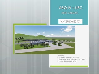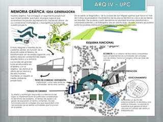 Este documento presenta el anteproyecto de un complejo de centros culturales, sociales e interpretación ubicado en San Miguel. El proyecto se basa en la topografía e implantación del lugar y propone edificios de baja altura con fachadas ventiladas, cubiertas verdes y espacios abiertos. Incluye los esquemas funcional y estructural, planos y detalles de los tres centros que conforman el complejo.
