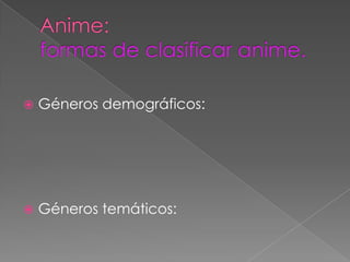 Este documento presenta diferentes géneros demográficos y temáticos de anime. Describe géneros como aquellos dirigidos a mujeres adultas, audiencias infantiles, adolescentes masculinos y femeninos, así como géneros temáticos que incluyen mecha, romance, comedia, acción, fantasía y más. El documento concluye agradeciendo la atención del público.