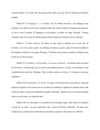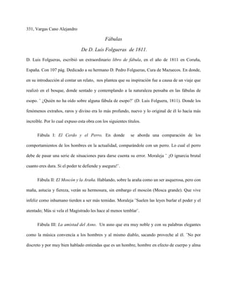 El documento resume un libro de fábulas escrito por D. Luis Folgueras en 1811 en La Coruña, España. El libro contiene 15 fábulas con moralejas. Cada fábula presenta una breve historia con animales y incluye una reflexión final. Los temas incluyen comparaciones humanas, amistad, poder, talento y conocimiento. El documento provee el título y moraleja de cada fábula.