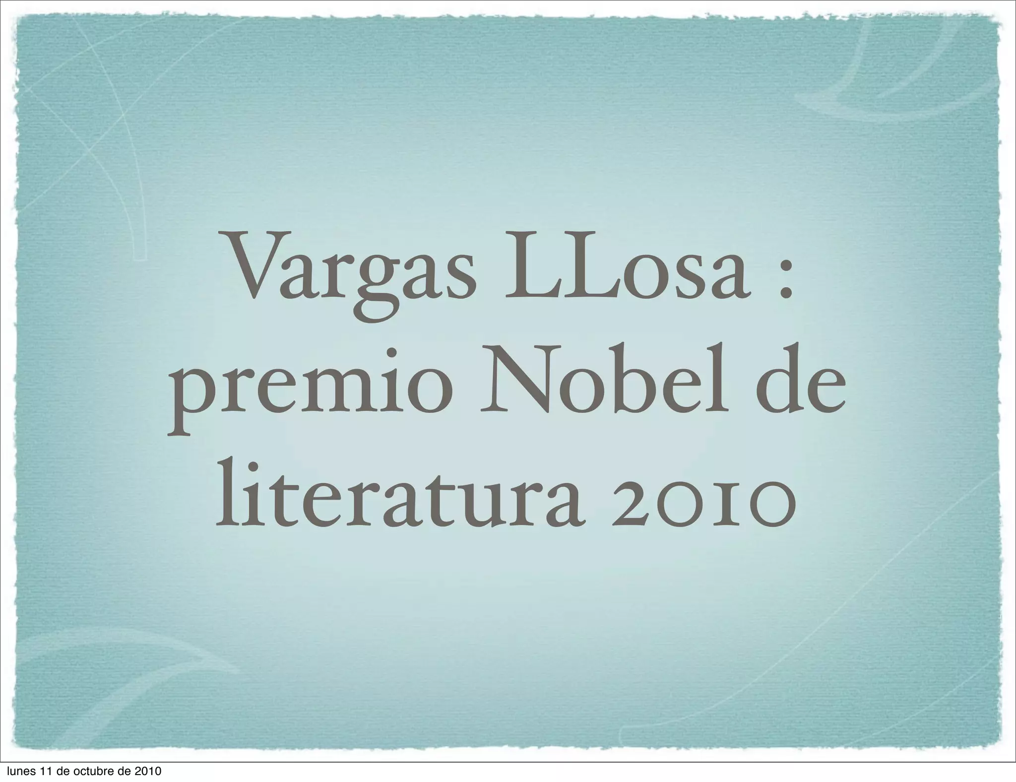El documento proporciona instrucciones para encontrar obras del escritor peruano Mario Vargas Llosa en la biblioteca, luego de haber ganado el Premio Nobel de Literatura en 2010. Indica que las obras de Vargas Llosa se encuentran en la sección 8LE(PE) Var de la sala primera del centro de la biblioteca, y también ofrece instrucciones para realizar una búsqueda en el catálogo introduciendo su nombre como autor.