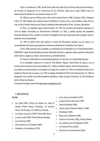 Mario Vargas Llosa nació en 1936 en Perú. Estudió en varias escuelas en Perú y Bolivia. Obtuvo un doctorado en Filosofía y Letras en España y vivió varios años en París trabajando como profesor y periodista. Es uno de los escritores latinoamericanos más importantes y ha publicado numerosas novelas, ensayos, obras de teatro y artículos periodísticos. En 2010 recibió el Premio Nobel de Literatura.