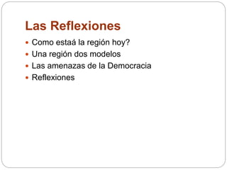 Este documento analiza la situación actual de América Latina y el Caribe, identificando logros y desafíos. La región ha corregido problemas históricos como la inflación y ha establecido la democracia, aunque existen dos modelos de desarrollo: uno que fomenta la cooperación y la inversión, y otro que es antiestadounidense y débil institucionalmente. Las amenazas incluyen inseguridad, desigualdad social, baja calidad educativa, y daño ambiental como la deforestación. El documento pro