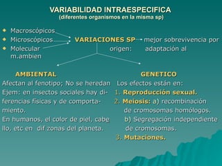 El documento resume los conceptos fundamentales de la variabilidad y herencia biológica. Explica la variabilidad intraespecífica y las variaciones entre poblaciones. Luego describe la relación entre genotipo y fenotipo, y cómo el ambiente puede influir en la expresión de los rasgos. Finalmente, resume los experimentos pioneros de Gregor Mendel con guisantes, incluidas sus tres leyes de la herencia y cómo establecieron las bases de la genética clásica.