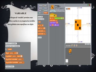 El documento presenta información sobre Nicolás Suarez Sánchez, un profesor de electrónica y tecnologías de la información en el Colegio Nacional Nicolás Esquerra. Explica el uso de variables en la programación, permitiendo crear y usar variables tanto globales como específicas a objetos. Muestra cómo crear una variable llamada "valor" para almacenar el resultado de tirar un dado entre 1 y 6.