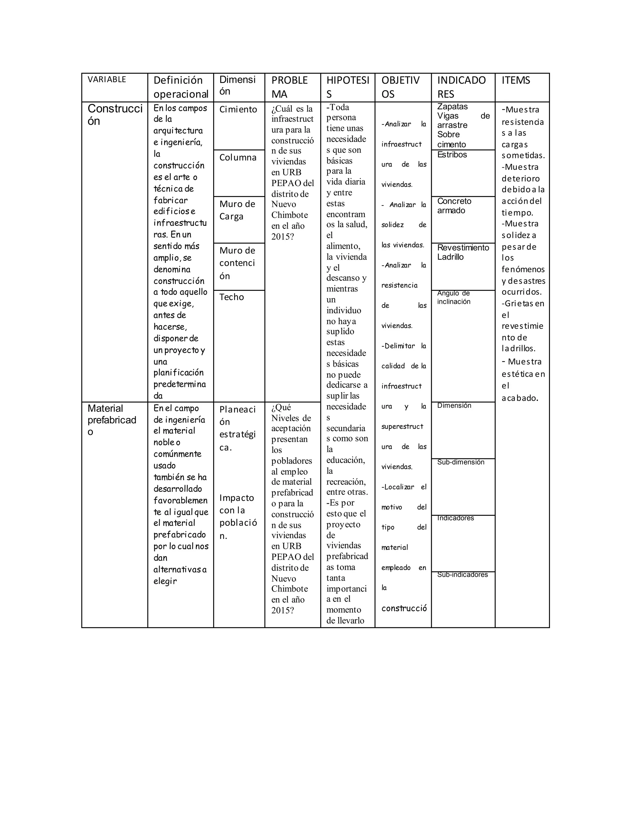 Este documento trata sobre un proyecto de investigación para analizar la infraestructura de las viviendas prefabricadas en una zona urbana de Perú. Presenta la variable, dimensión, problema, hipótesis, objetivos e indicadores que se utilizarán para medir factores como la solidez, resistencia y calidad de la construcción, así como los niveles de aceptación de los residentes hacia el uso de materiales prefabricados.