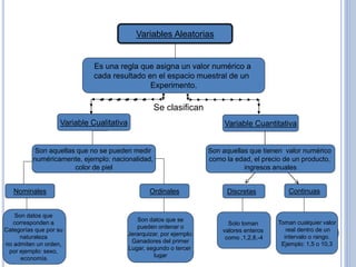 Este documento resume los tipos de variables aleatorias, incluyendo variables cualitativas y cuantitativas. Las variables cuantitativas se clasifican como nominales, ordinales, discretas o continuas dependiendo de si representan categorías sin orden, datos jerarquizables, valores enteros o cualquier valor real, respectivamente.