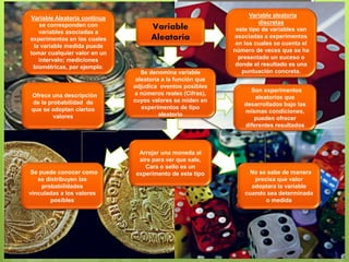 Una variable aleatoria describe los posibles resultados de un experimento aleatorio asignando números reales a esos resultados. Las variables aleatorias pueden ser discretas, cuando los resultados se cuentan o son puntuaciones específicas, o continuas, cuando los resultados pueden tomar cualquier valor dentro de un intervalo. Arrojar una moneda al aire para ver si sale cara o sello es un ejemplo de experimento aleatorio cuya variable sería discreta.