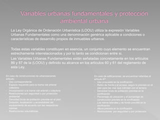 Este documento describe las Variables Urbanas Fundamentales que deben considerarse en los procesos de desarrollo urbano según la Ley Orgánica de Ordenación Urbanística (LOOU) de Venezuela. Estas variables incluyen condiciones como el uso de suelo, densidad poblacional, equipamiento, y restricciones ambientales. También señala la necesidad de incorporar estas variables ambientales en la elaboración de planes urbanos y en la aprobación de proyectos de urbanización y edificación, para garantizar un desarrollo urbano sostenible.