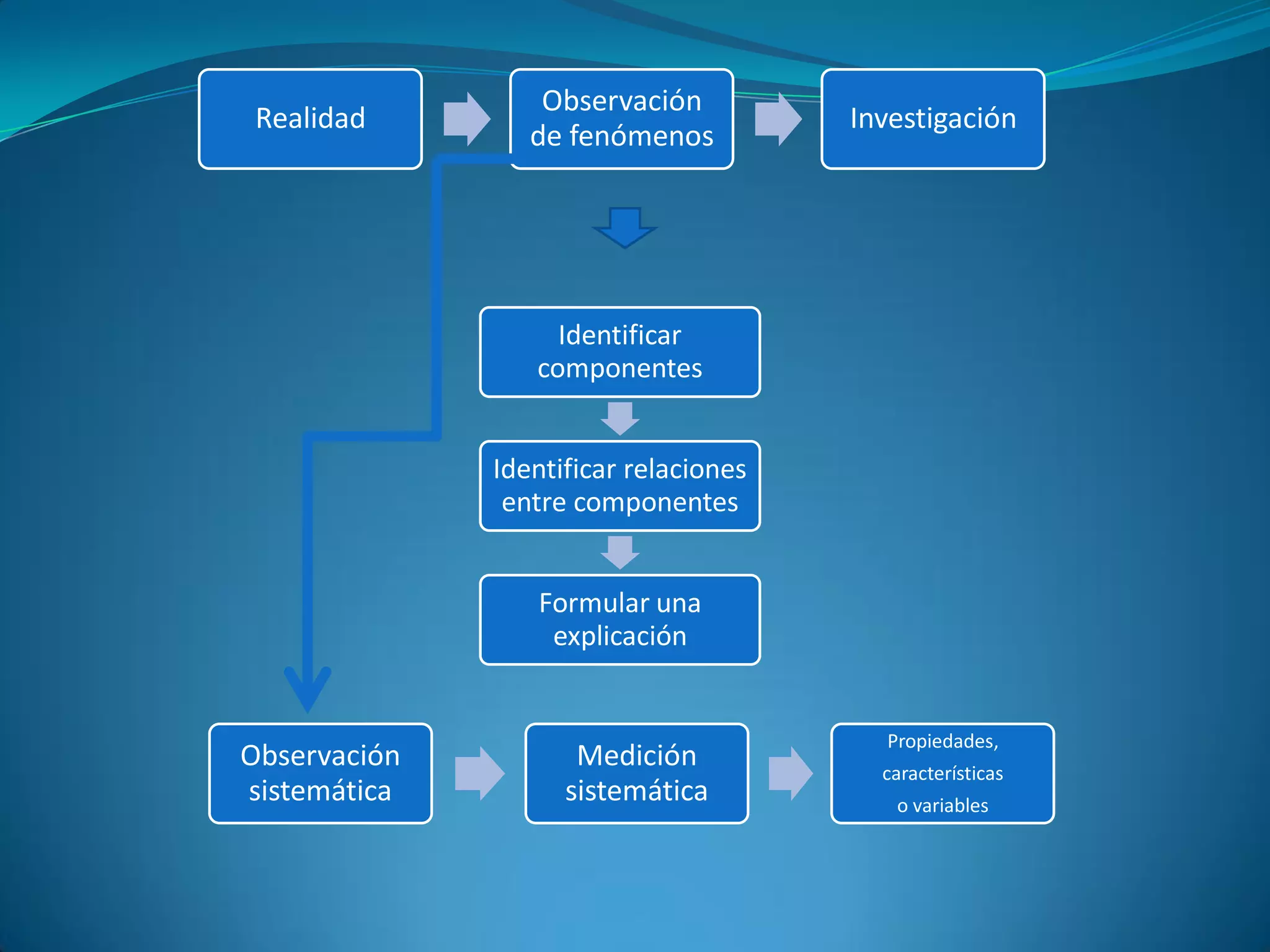 Observación Realidad Investigación de fenómenos Identificar componentes Identificar relaciones entre componentes Formular una explicación Propiedades, Observación Medición características sistemática sistemática o variables