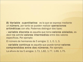 Este documento describe los tipos de variables estadísticas. Hay dos tipos principales de variables: cualitativas y cuantitativas. Las variables cualitativas no se pueden medir numéricamente y pueden ser nominales u ordinales. Las variables cuantitativas se expresan numéricamente y pueden ser discretas o continuas.