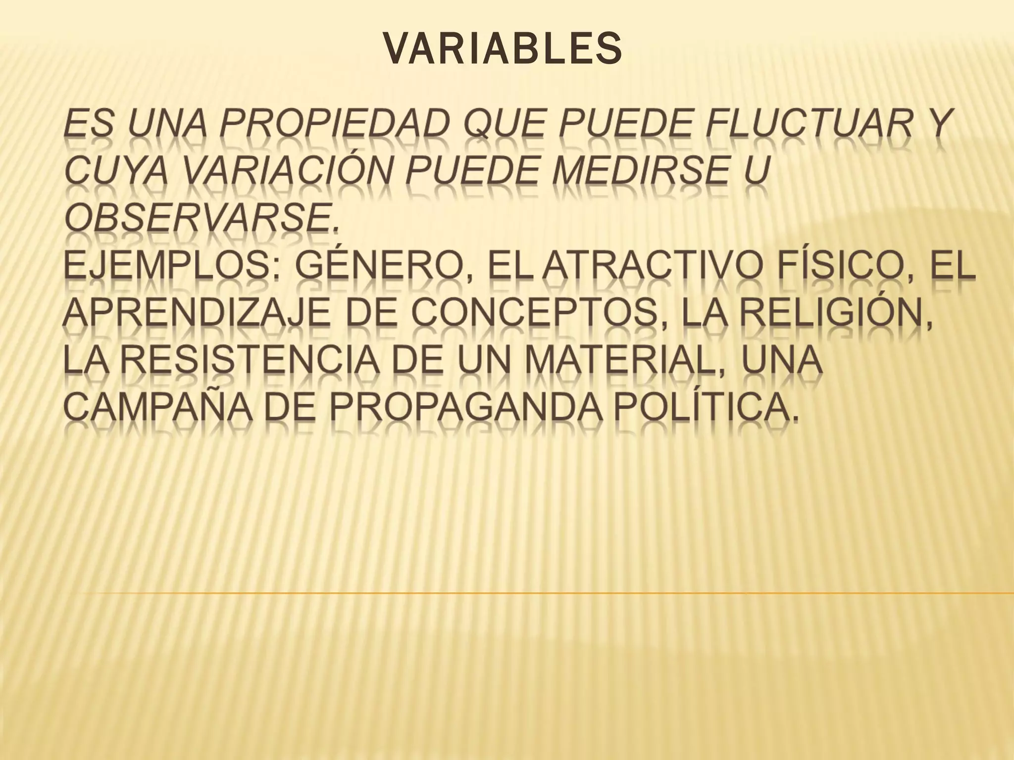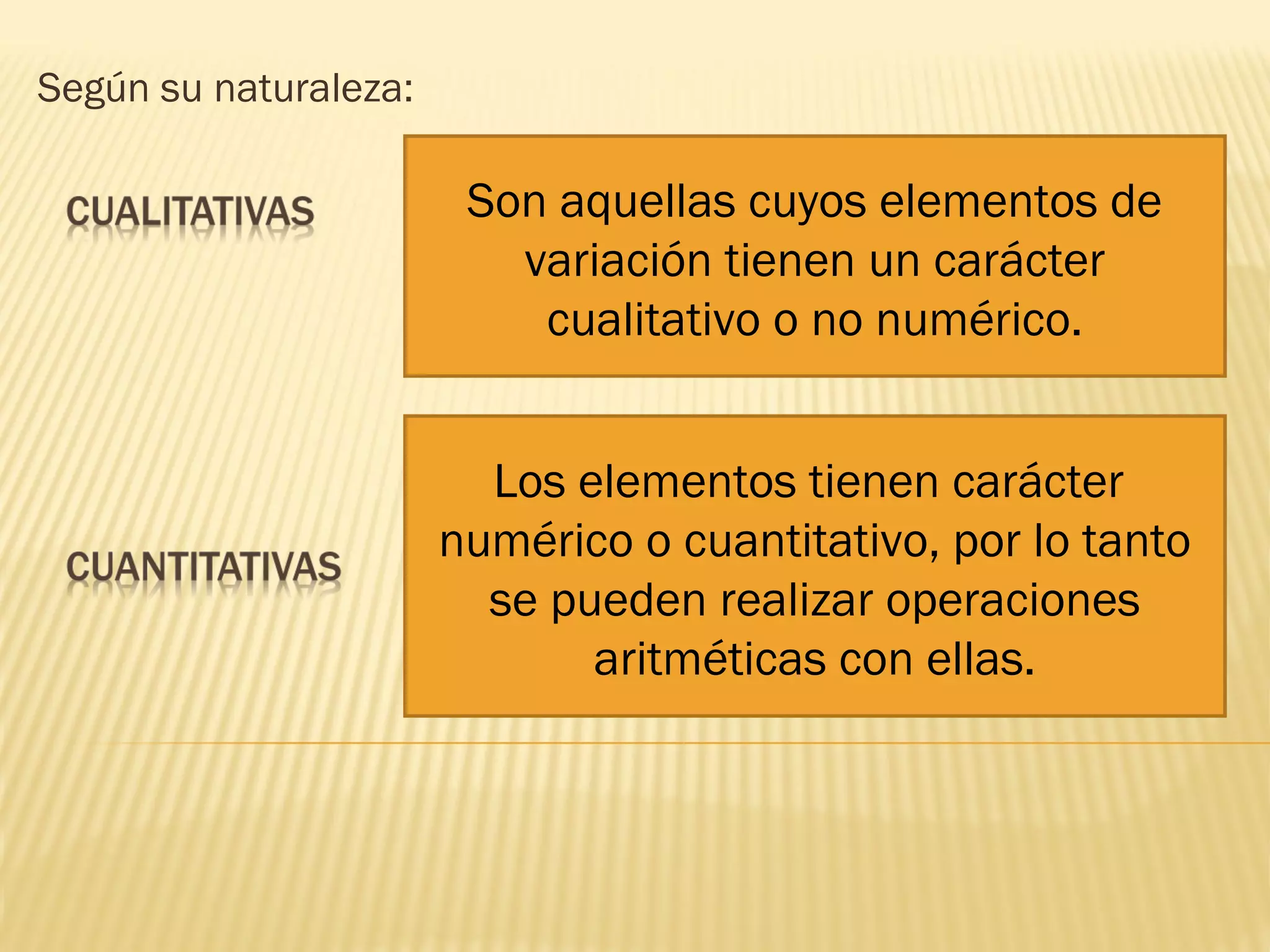 Este documento describe diferentes tipos de variables según su naturaleza, características y relación con otras variables. Las variables pueden ser cualitativas o cuantitativas dependiendo de si sus elementos de variación son cualitativos o numéricos. Las variables cuantitativas pueden ser agrupadas o no agrupadas, discretas o continuas. También se clasifican según el tipo de escala, ya sea nominal, ordinal o de intervalo/razón. Finalmente, se distinguen las variables dependientes, que son las que se intentan explicar, de las independientes o explicativas,