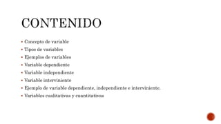 El documento explora el concepto de variables en la investigación, abarcando sus tipos, como variables dependientes, independientes e intervinientes, y su importancia en la formulación de hipótesis. Se presentan ejemplos de variables cualitativas y cuantitativas, así como su medición y relación en estudios experimentales. También se clasifican las variables en nominales, ordinales, de intervalo y discretas, resaltando sus características y aplicaciones.