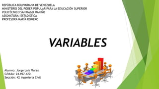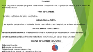 Este documento define conceptos básicos de estadística como variables, población, muestra, parámetros, estadísticos, escalas de medición, sumatoria, razón, proporción, tasa y frecuencia. Explica que las variables pueden ser cualitativas o cuantitativas y nombrar ejemplos de cada tipo. También distingue entre estadística descriptiva e inferencial, señalando que la primera se enfoca en describir datos mientras la segunda permite inferir conclusiones sobre una población a partir de una muestra.