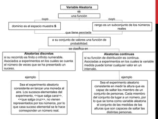 Este documento clasifica las variables aleatorias en discretas y continuas. Las variables aleatorias discretas tienen un recorrido finito o infinito numerable, asociadas a experimentos que cuentan sucesos. Las variables aleatorias continuas tienen una función de distribución continua, asociadas a experimentos donde la variable medida puede tomar cualquier valor en un intervalo. Se proveen dos ejemplos para ilustrar estas clasificaciones.