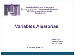 Este documento es un informe de la estudiante Irliana Caridad sobre el curso de Estadística II en la Universidad Politécnica Santiago Mariño en Maracaibo, Venezuela en junio de 2015, que cubre el tema de Variables Aleatorias.
