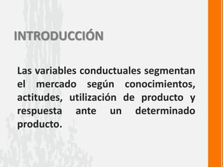 Este documento describe los diferentes tipos de segmentación de mercado basados en variables conductuales, incluyendo la búsqueda de beneficios, la tasa de utilización del producto, y la fidelidad a la marca. Explica que la segmentación conductual divide el mercado según los conocimientos, actitudes y respuestas de los consumidores hacia los productos.