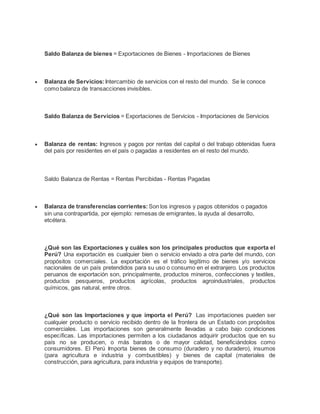 La balanza de pagos es un documento contable que registra todas las transacciones comerciales, de servicios y movimientos de capital entre residentes de un país y el resto del mundo. La cuenta corriente de la balanza de pagos incluye el comercio de bienes, servicios y rentas, subdividida en las balanzas comercial, de servicios y de rentas. La balanza de pagos proporciona información detallada sobre todas las transacciones transfronterizas.