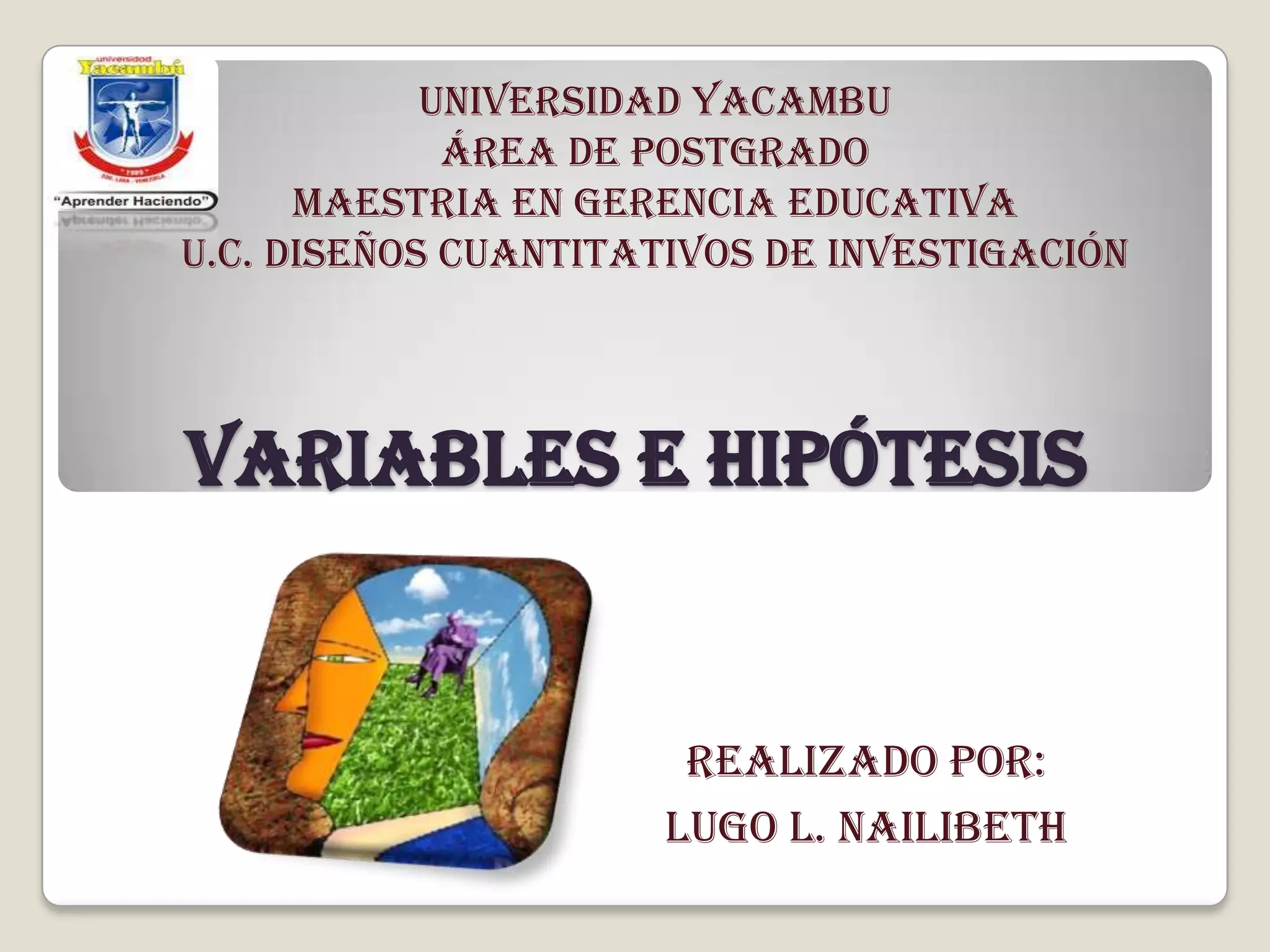 Este documento presenta información sobre variables e hipótesis en investigación. Define qué son las variables y las hipótesis, y describe sus tipos y características. Explica que las variables son aspectos o características cuantitativas o cualitativas que son objeto de estudio, mientras que las hipótesis son propuestas tentativas sobre algún fenómeno que se investiga. Además, detalla los diferentes tipos de variables y hipótesis según su naturaleza, escala de medición, función y otros criterios.