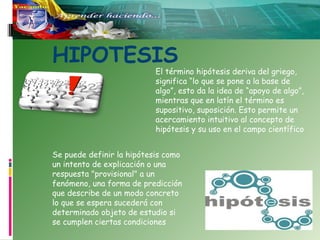 El documento presenta una introducción al concepto de hipótesis y variables, incluyendo sus definiciones, tipos y características. Explica que una hipótesis es una explicación provisional de un fenómeno que puede ser verdadera o falsa dependiendo de los resultados de la experimentación. También describe los diferentes tipos de variables, como independientes, dependientes e intervinientes, así como cualitativas y cuantitativas. Finalmente, detalla el proceso de operacionalización de variables, que incluye su definición conceptual y operacional para facilitar la medición en