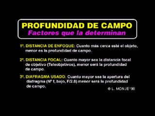 Este documento explica los tres factores principales que determinan la exposición en una fotografía: 1) la apertura del diafragma, 2) el tiempo de exposición, y 3) la sensibilidad del sensor. También describe cómo estos factores afectan la cantidad de luz que llega al sensor y cómo un aumento en la sensibilidad ISO puede dar lugar a más ruido en las zonas de sombra de una imagen. Además, explica los tres elementos que influyen en la profundidad de campo: la distancia de enfoque, la distancia focal del objetivo