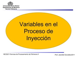 El documento describe las cinco variables fundamentales en el proceso de moldeo por inyección: temperaturas, presiones, tiempos, recorridos y velocidades. Explica que la mayoría de las dificultades en el ciclo de moldeo se corrigen ajustando estas cinco variables para lograr una producción eficiente de piezas con buena calidad. Detalla cada una de las variables y los parámetros asociados, como las temperaturas del cilindro, molde y aceite hidráulico, así como las diferentes presiones involucradas en el proceso.