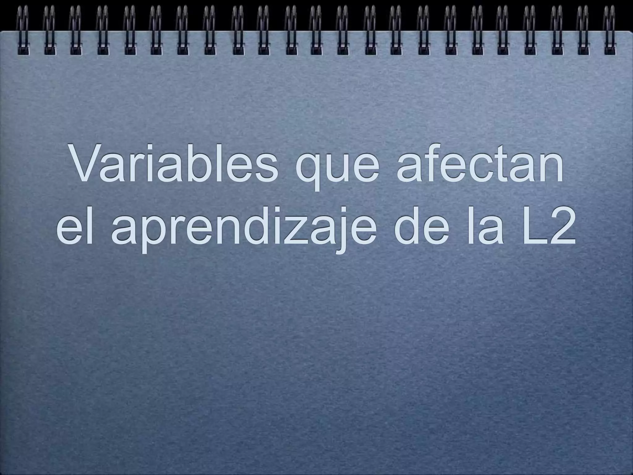 El documento describe varias variables que afectan el aprendizaje de una segunda lengua (L2), incluyendo factores relacionados al profesor, el proceso de aprendizaje, el contexto de uso de la L2, y características del aprendiz como su edad, aptitud, personalidad, motivación y estilo de aprendizaje. También incluye una serie de preguntas para identificar si el estilo de aprendizaje de una persona es visual, auditivo o táctil/cinético.