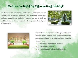 El documento aborda las variables urbanas fundamentales y su relación con la normativa ambiental y urbanística en Venezuela, destacando las leyes que regulan las modificaciones del espacio urbano. Se enfatiza la importancia de garantizar un desarrollo sustentable y la protección del medio ambiente a través de procedimientos y normas específicas. Además, se describen factores climáticos y geomorfológicos que afectan la planificación urbana y la interacción entre el entorno natural y el construido.