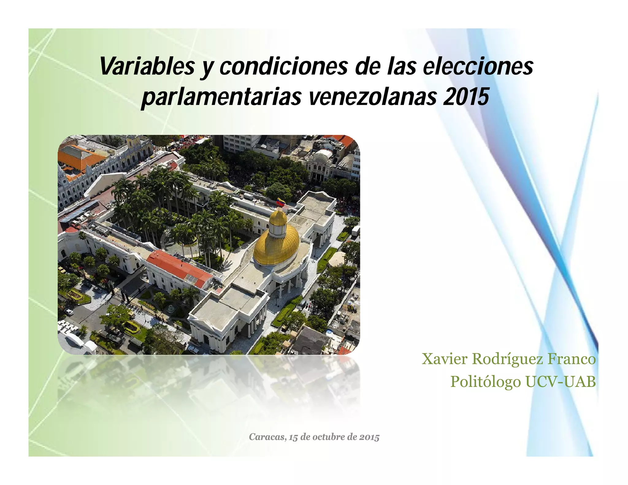 El documento analiza las variables y condiciones políticas de las elecciones parlamentarias en Venezuela en 2015, subrayando la conflictividad social, la percepción pública del Parlamento y el desempeño institucional de la Asamblea Nacional. Se trata de un contexto marcado por la crisis económica, la intervención militar en política y la escasa transparencia legislativa. Se concluye que las elecciones son decisivas para una posible transformación política en el país, en un ambiente de recursos limitados y alta tensión electoral.