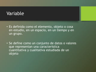 El documento define variables en investigación, describiendo sus características, identificación y operacionalización en estudios cuantitativos. Se clasifican las variables según su naturaleza (cualitativa y cuantitativa), amplitud (individual y colectiva), nivel de abstracción (general, intermedia y empírica) y escala de medición (nominal, ordinal, cardinal). Además, se abordan las relaciones causales entre variables, como independientes, dependientes, extrañas y confusionales.
