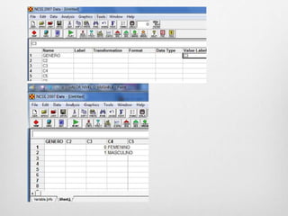 El documento describe diferentes tipos de variables, incluyendo variables nominales, ordinales, discretas y continuas. Explica que las variables nominales tienen categorías sin orden, mientras que las ordinales tienen categorías ordenadas. Las discretas y continuas pueden tomar valores enteros o cualquier valor dentro de un rango, respectivamente. También discute las escalas de medición como nominal, ordinal e intervalo/proporcional y cómo afectan el tipo de estadística y potencia que puede usarse.