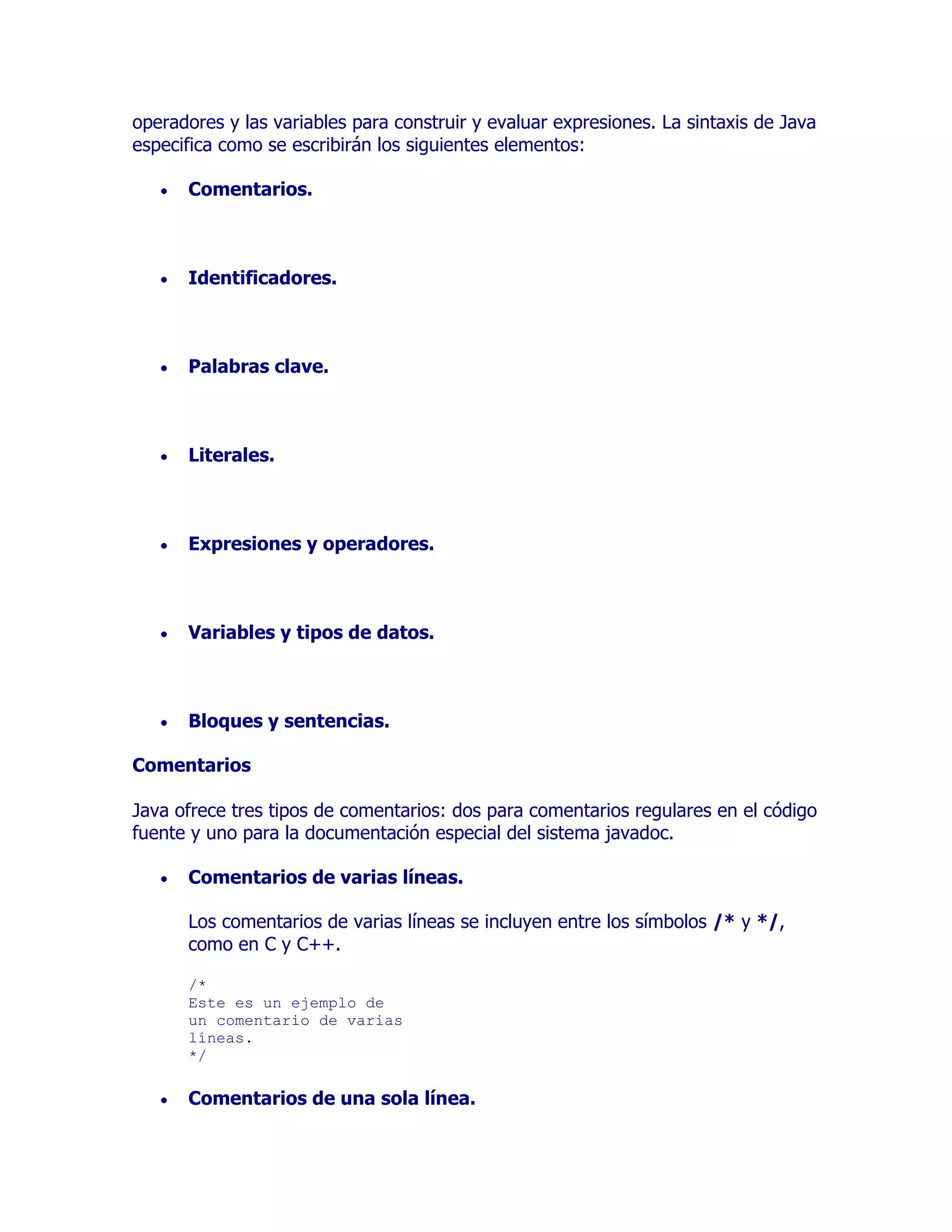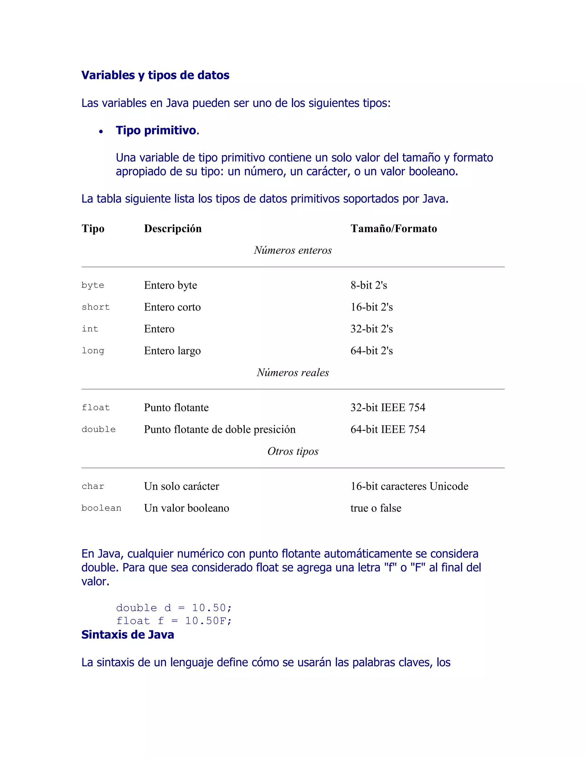 Las variables en Java pueden ser de tipos primitivos como números enteros, reales, caracteres y booleanos, o tipos de referencia como cadenas y objetos. Los tipos primitivos almacenan valores directamente mientras que los tipos de referencia almacenan referencias a objetos. La sintaxis de Java define elementos como comentarios, identificadores, palabras clave, literales, expresiones y operadores para construir programas.