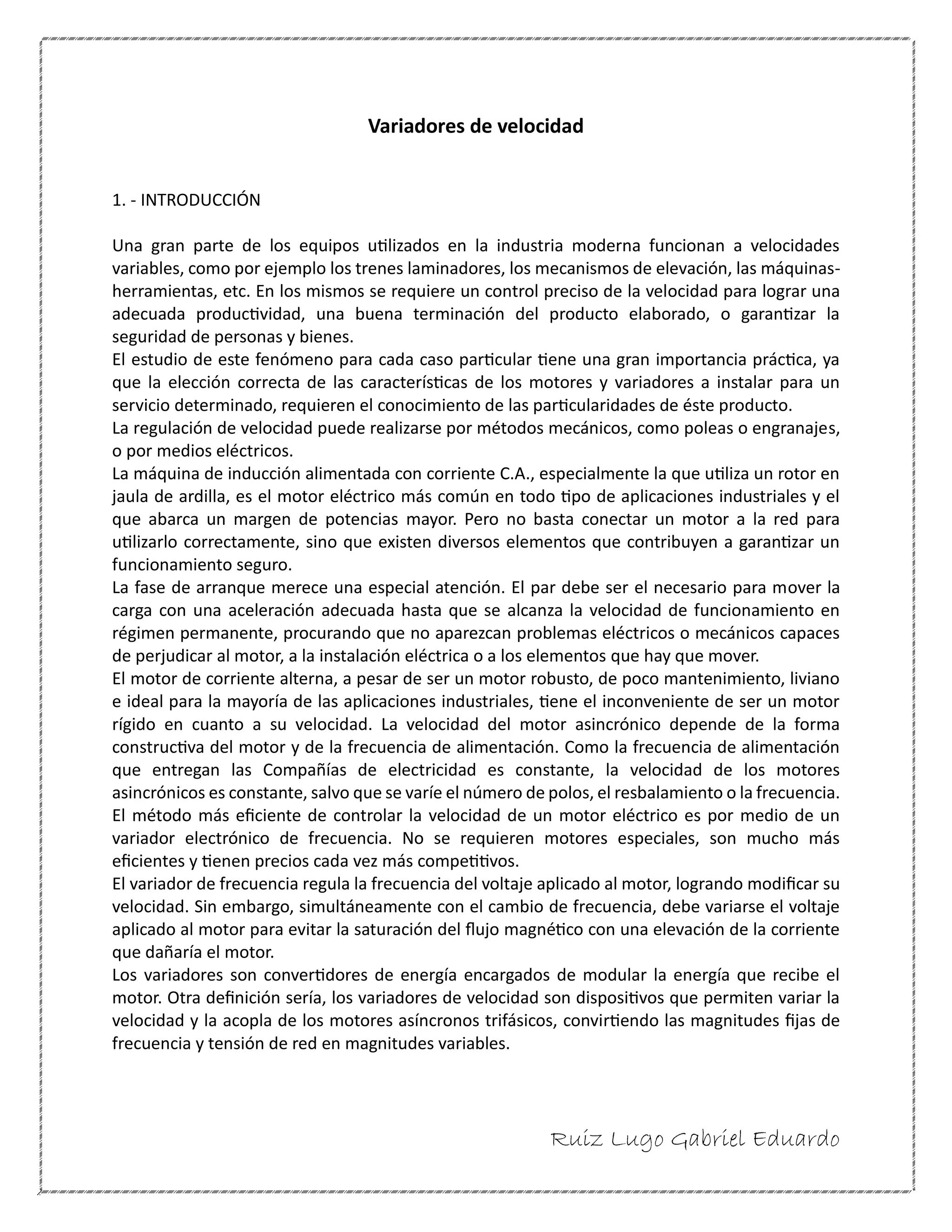 Este documento describe los variadores de velocidad y su uso para controlar la velocidad de motores eléctricos de manera variable. Los variadores de velocidad convierten la tensión y frecuencia fijas de la red eléctrica en magnitudes variables que permiten regular la velocidad del motor. Estos dispositivos se utilizan principalmente para controlar con precisión el par y la velocidad de máquinas y equipos industriales como transportadoras, bombas, ascensores y prensas.