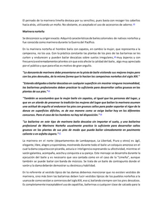 La marinera posee muchas variantes regionales en el Perú, incluyendo la marinera limeña, norteña, arequipeña y puneña. La marinera limeña se baila elegantemente con pañuelo y vestido de seda hasta los tobillos. La marinera norteña se distingue porque la mujer baila descalza, siguiendo la tradición campesina, y desarrolla callos gruesos en los pies. La marinera arequipeña es más similar a la cueca chilena y se baila de manera alegre